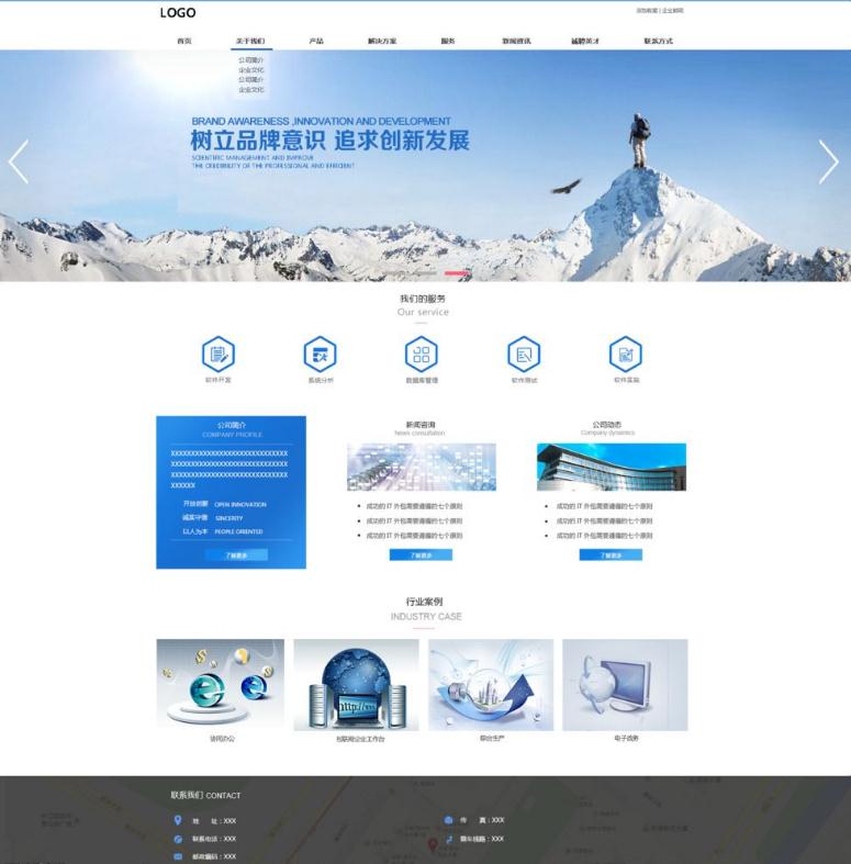 首页,公司介绍,产品中心(分二级),新闻中心,成功案例,资料下载,视频中心,人才招聘,在线留言,联系我们等 | 可分二级、下拉特效、资料下载等 |